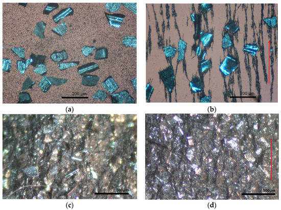 Optical micrographs of a mixture of NdFeB and Fe particles in silicone oil (a) in the absence of any magnetic field and (b) after the magnetization in the magnetic field of 1T (the red arrow shows the direction of the magnetizing field). Optical micrographs of a section of MAE–Fe sample (c) after preparation and (d) after magnetization in the magnetic field of 1.5 T.