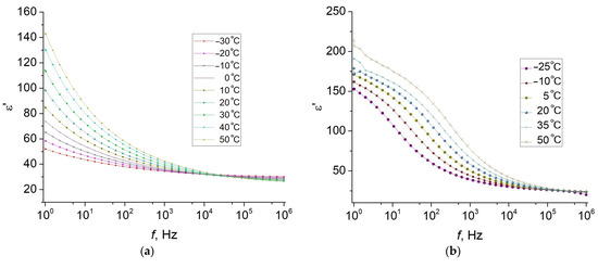 The real and imaginary parts of the relative permittivity and the loss factor were measured for all samples using an impedance analyzer Novocontrol Alpha-A (Installation Concept 40) and the dielectric cell ZGS Alpha Active Sample Cell with gold disk electrodes with a diameter of 20 mm. Measurements were performed in the frequency range of 10−1–106 Hz. Electrodes of 20 mm in diameter made from 10 mm thick Al foil were pasted on the two opposite surfaces of each disk sample. The foil electrodes were glued to the sample surface with silver-containing conductive adhesive D-550 produced by Dotite, Japan. Measurements were carried out in the temperature range from −30 °C to +50 °C, where the most significant changes in electrical properties took place. It should be noted that during the spectroscopy measurement of magnetized samples, the applied electric field was oriented in the same direction as the magnetization field.
