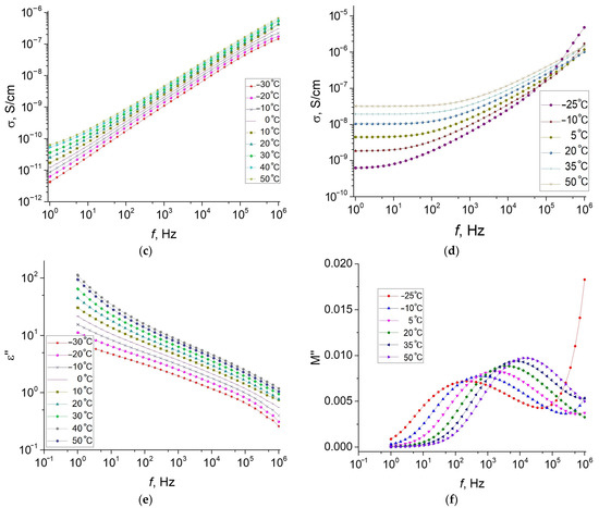 Figure 3 shows the dielectric characteristics of the hybrid MAEs (the samples MAE–Fe and MAE–Fe–m) as functions of frequency at various temperatures. As can be seen, all the dependences differ significantly for the original (Figure 3a,c,e) and magnetized (Figure 3b,d,f) composites. The magnetized sample MAE–Fe–m is characterized by much larger values of the dielectric permittivity (Figure 3b) than the non-magnetized one, and the frequency dependences of the conductivity demonstrate the presence of a DC conductivity in the magnetized MAE–Fe–m, which is reflected by the appearance of characteristic plateaus. In this case, the imaginary dielectric permittivity is inversely proportional to frequency, exhibiting common behavior. Due to a rather high conductivity in the magnetized composite, the dielectric losses are high; therefore, in Figure 3f, we plot the frequency dependences of the imaginary part of the electric modulus, , for the magnetized sample. This presentation makes it possible to eliminate the effects of electrode polarization and conductivity. The electric modulus is defined as the inverse of the complex dielectric constant: