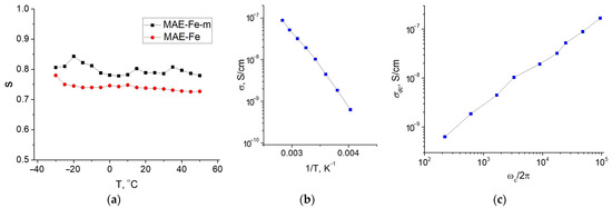 Figure 4a shows the temperature dependence of the parameter s in the frequency dependence of (Equation (1)) obtained for the original MAE–Fe and the magnetized MAE–Fe–m samples. As can be seen, for both samples, the parameter s weakly depends on temperature; however, its value is slightly higher for the magnetized sample. The effective activation energy determined from the Arrhenius-type dependence of the conductivity (see Figure 4b) is equal to 0.55 eV. Thus, the obtained results indicate that the conductivity has a hopping character. In this case, the non-magnetized composite is in a dielectric regime of conductivity, while the magnetized one is characterized by a significant component of the DC conductivity . It means that during the magnetization of MAEs, a transition from a non-conducting to a conducting state takes place. In other words, during magnetization, the composite experiences a transition from a regime below the percolation threshold to that above the threshold, apparently due to a contraction of particle clusters, which results in a considerable decrease in the average distance between the filler particles.