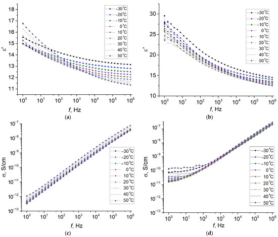 Frequency dependence of the dielectric permittivity (a,c) and conductivity (b,d) of MAE–0 (a,b) and MAE–0–m (c,d) at various temperatures.