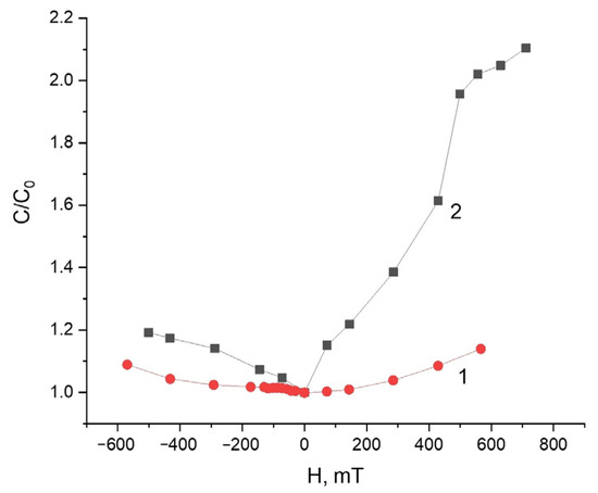 Magnetic field dependence of the relative capacitance of the capacitor filled with (1) an initial MAE–0 and (2) magnetized MAE–0–m, f = 1 MHz.