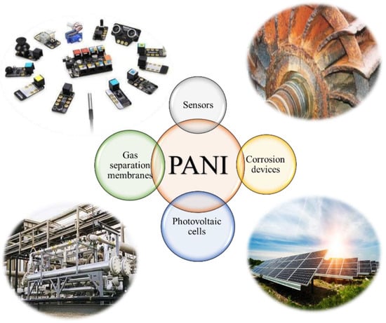PANI has potential applications in various fields, such as organic electronics, biomedical fields, and anti-corrosion materials due to its extraordinary properties, such as exceptional electrical features, decent chemical and environmental stability, low cost, and easy preparation process [33]. It has several applications, such as chemical sensors [34,35], corrosion devices [36], photovoltaic cells [37], and gas separation membranes [38], as shown in Figure 1. In addition to all the probable applications detailed above, PANI microtubes/nanofiber and PANI-multi-walled carbon nanotubes [39] and nanocomposites are used as microwave safeguards and electromagnetic shielding materials [40].