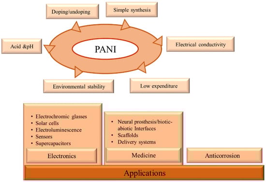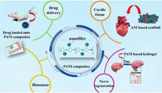 - Zare, E.N.; Makvandi, P.; Ashtari, B.; Rossi, F.; Motahari, A.; Perale, G. Progress in Conductive Polyaniline-Based Nanocomposites for Biomedical Applications: A Review. J. Med. Chem. 2020, 63, 1–22. [Google Scholar] [CrossRef] [PubMed]