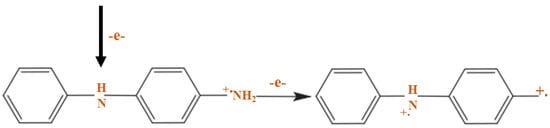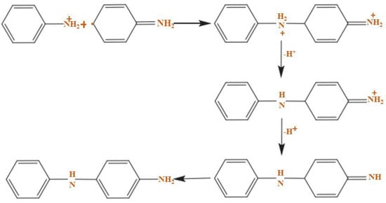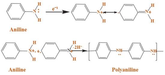 The existence of the dopant is significant because the charge carriers and the conductivity of the polymer can be affected by the grade and type of dopant used. Two forms of redox doping can be used in the process of producing a conductive polyaniline polymer: the first is n-type doping (reduction) and the second is p-type doping (oxidation) [72,73,74]. A radical cation is made during polymerization development by removing an electron from the structure of a monomer. Any radicals that are produced will be joined together to form a monomer chain. The following equation shows a simple reaction that demonstrates chemical polymerization [75];