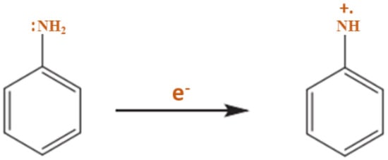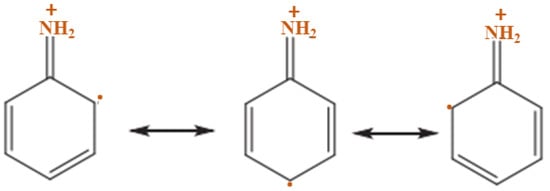 Aniline radical cation in the resonating form. Reproduced with permission from Materials Chemistry and Physics, Vol 69, Koval, E.P.; Whittingham, S.; Skolozdra, O.M.; Zavalij, P.Y.; Zavaliy, I.Y.; Reshetnyak, O.V; Seledets, M. Co-polymers of aniline and nitroanilines. Part I. Mechanism of aniline oxidation polycondensation, pp. 154–162. Copyright (2001), with permission from Elsevier.