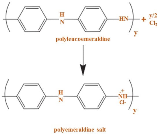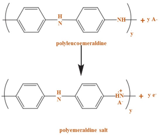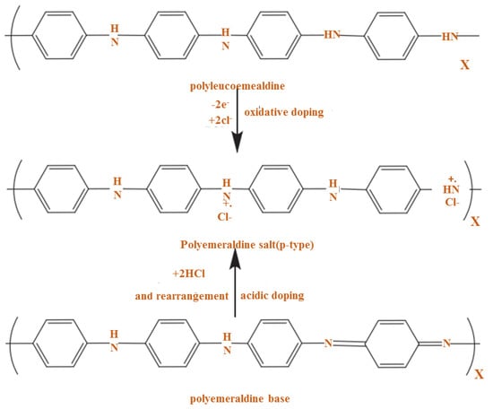 Here, doping is used to indicate similarities with some semiconductors such as silicon (Si) or germanium (Ge) in that P or B atoms are presented. Doping in the CP causes oxidation or reduction, so the polymers can be considered p and n-type, respectively. Given the conduction mechanism of PANI, which is the polymer-based proton or poly-alkomeral oxidation, it is a prominent conductive polymer. In this process, PANI is converted to the polymeraldine salt form shown in Figure 11 [70].