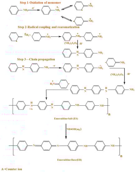 In chemical oxidation polymerization, PANI is synthesized by using hydrochloric acid (HCl) or sulfuric acid (H2SO4) as a dopant and ammonium persulfate (APS) as an oxidant in an aqueous environment [63,64]. At this time, a proton can be removed by the oxidant from the monomer of aniline without either creating a heavy bond, or with the absolute product (Figure 5).