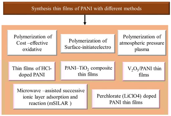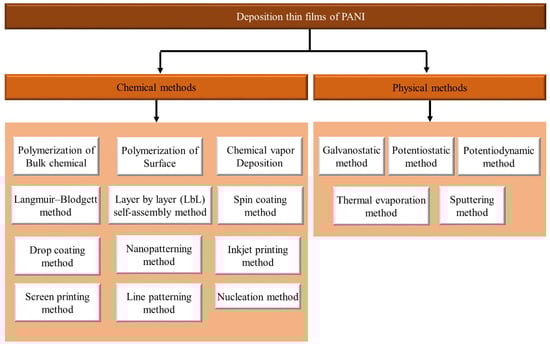 Several methods can be adopted for the deposition of thin films of PANI. As shown in Figure 16, these techniques include chemical and physical methods.