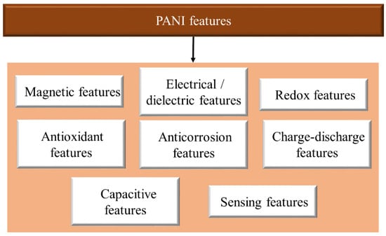 Amongst all intrinsic conducting polymers (ICPs), PANI has attracted the attention of many researchers due to its reversible doping/dead doping properties, remarkable electrical conductivity, pH change properties, low expenditure, simple synthesis, and environmental stability [59]. It also has the unique ability to be doped by proton acids (proton doping) apart from conventional redox doping. PANI, through its molecular self-assembly, often forms super-molecular nanofibers, lending itself to a variety of applications due to completely different and new properties because of the high surface-to-volume ratio. Several PANI nanostructures such as nanofibers, nanotubes, and nanospheres have been developed by a set of synthesis methods [60]. The introduction of a secondary component, such as nanomaterials, in PANI, further expands its performance, providing efficient designs and advanced performance. Cooperation between individual components enhances the properties of the nanocomposite and expands its scope of application [11]. The development of PANI nanostructures and their nanocomposites stems from the desire to discover the full potential of these materials. Figure 3 shows the prominent properties and remarkable usage of PANI.