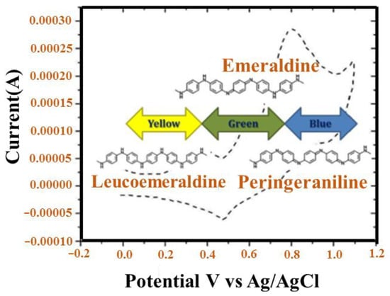 The oxidative polymerization produced regularly follows an ion change during polymerization. Initially, it was a colorless solution that turned blue and dark blue, indicating that PANI dimers and oligomers were formed. This method has a prominent property, in which rapid staining is performed, and the polymerization continues during a certain induction period. The speed of the method depends on several factors, such as the nature of the oxidant and the concentration of the reactant [94]. Most resulting CEPs can be deposited, such as a thin film of different layers with the reaction medium. Different CEPs show several oxidation states. Hence, there is conductivity according to their shape. By removing an electron from the organization by anion doping, the polaronic form of half the oxide is obtained. Similarly, by removing the second electron, an oxide dipole form is produced. Consequently, the PANI-EB formula demonstrates the highest conductivity between PANI-LE and PANI-PB.