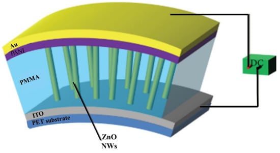 - Liu, Y.Y.; Wang, X.Y.; Cao, Y.; Chen, X.D.; Xie, S.F.; Zheng, X.J.; Zeng, H.D. A Flexible Blue Light-Emitting Diode Based on ZnO Nanowire/Polyaniline Heterojunctions. J. Nanomater. 2013, 2013, 870254. [Google Scholar] [CrossRef]