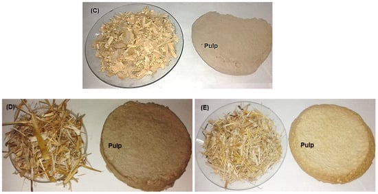 The results for the chemical compounds of the raw materials (Table 2) show that benzene–alcohol extracts, lignin, holocellulose, and ash content were 1.73–13.16%, 16.66–42.33%, 53.37–63.40%, and 1.66–6.73%, respectively. The holocellulose content in S. bicolor stalks was in accordance with the range of values reported in the literature: 71.0% [], 67.2% [], 68.0% from depithed extraction [], 61.6% extracted with 1% NaOH [], 69.0% from depithed extraction [], and 61.6% extracted with 1% NaOH []. The average pulp yield from S. bicolor stalks was 45%, and the average kappa number was 14–18 when 16–20% sodium (NaOH) and a 1.5 h cooking time at 160 °C were used []. The holocellulose content in Z. mays (62.33%) and S. bicolor (63.40%) stalks was higher than that in lotus leaf stalks (53.8%) [].