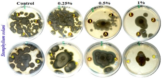 Fourteen days after incubation, and with an increase in the extract concentration, the inhibition or suppression of fungal growth occurred. According to visual observations and compared with the control treatments, no fungal growth of A. fumigatus occurred on paper discs of B. speclabilis pulp wood or pulp paper produced from Z. mays and S. bicolor stalks and treated with 1% MAHE, or pulp paper produced from F. elastica and treated with 0.50% and 1% of MAHE. At MAHE concentrations of 0.50% and 1%, F. culmorum showed no growth on paper discs manufactured from B. speclabilis, F. altissima, F. elastica, and Z. mays pulp, with visual inhibition zones found (Table 7), while no growth was found following treatment with 1% MAHE on paper discs made from S. bicolor pulp. Furthermore, nearly no growth of S. solani was found on paper discs manufactured from the raw materials treated with 1% MAHE, and inhibition zones were found.