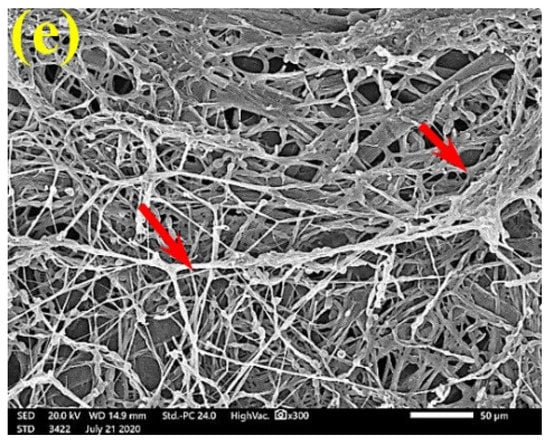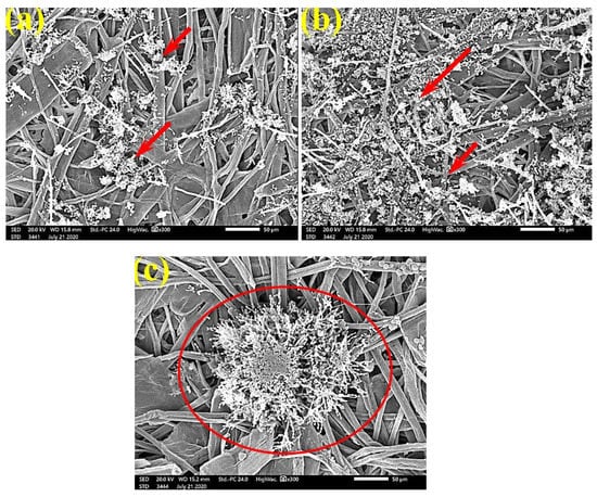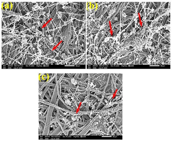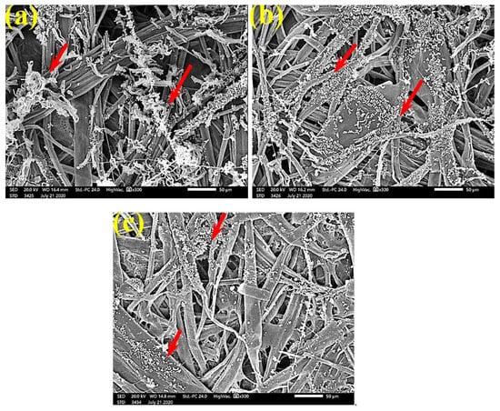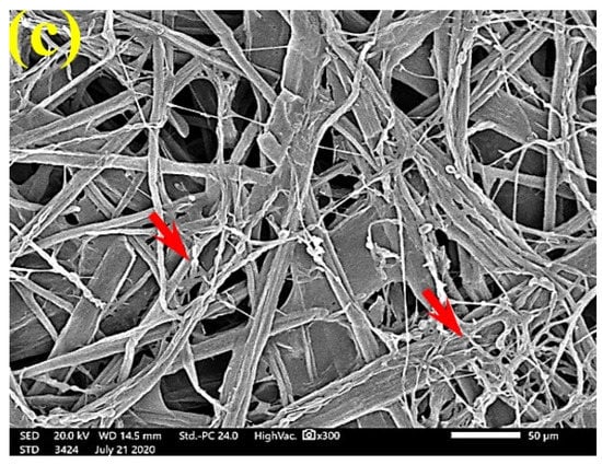 SEM images of the paper sheets manufactured from (a) B. speclabilis, (b) F. altissima, and (c) F. elastica treated with 1% MAHE and inoculated with S. solani. Arrows refer to low growth of fungal mycelia based on the concentration of the extract and the type of paper sheet pulp.