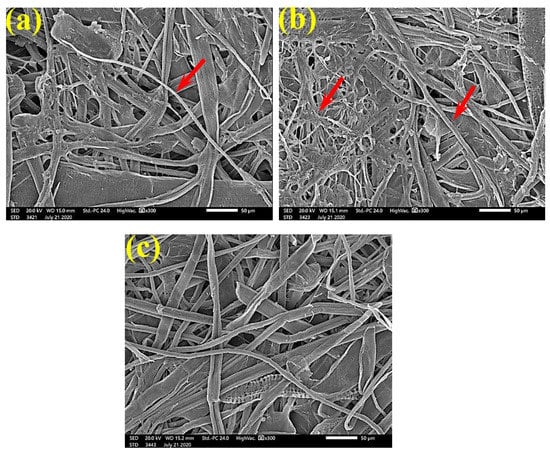 SEM images of the paper sheets manufactured from (a) Ficus altissima, (b) Sorghum bicolor treated with 0.5% MAHE, and (c) Ficus elastica treated with 1% MAHE and inoculated with F. culmorum. Arrows refer to low growth of fungal mycelia based on the concentration of the extract and the type of paper sheet pulp.