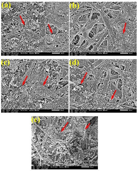 SEM images of the paper sheets manufactured from pulp of (a) Bougainvillea speclabilis, (b) Ficus altissima, (c) Ficus elastica, (d) Zea mays, and (e) Sorghum bicolor treated with 10% DMSO (control) and inoculated with F. culmorum. Arrows refer to dense growth of fungal mycelia in the sample fibers.