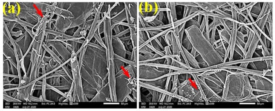 SEM images of paper sheets manufactured from (a) B. speclabilis and (b) F. altissima treated with 0.5% MAHE and inoculated with S. solani. Arrows refer to low and no growth of fungal mycelia based on the concentration of the extract and the type of paper sheet pulp.
