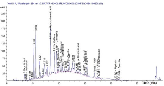 The previous results clearly show that by increasing the concentration of MAHE, the suppression of fungal growth occurs. Additionally, some treatments resulted in no fungal growth. These results could be related to the phytochemical compounds present in the extract. Table 8 presents the chemical compounds presented in MAHE. The main compounds (in mg/kg) are p-hydroxybenzoic acid (3966.88), caffeine (1032.67), rutin (quercetin 3-O-rutinoside) (834.13), chlorogenic acid (767.81), benzoic acid (660.64), quinol (594.86), quercetin (460.36), vanillic acid (366.13), myricetin (302.404), and caffeic acid (130.97). Figure 13 shows the chromatogram peaks that were used to separate the chemical compounds in MAHE.