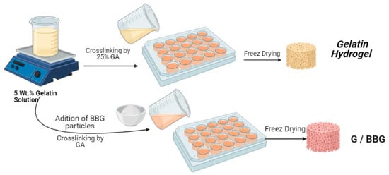 Gelatin solution (5 w/v%) was made by dissolving gelatin (0.5 g) in deionized water (10 mL) and stirring it for 2 h at 50 °C. After that, ultrasonic vibration was used to suspend 3 wt.% and 5 wt.% of synthesized BBG-NPs in the solution for 30 min. After stirring for 2 h, the bioglasses containing hydrogels were cross-linked with 5 µL·mL−1 GA and stirred for 1 h at room temperature, as shown in Figure 1. The cross-linked samples were repeatedly washed with DI water to remove the remnant GA. Prior to characterization, the obtained nanocomposite hydrogels were cooled to the temperature of −25 °C overnight and lyophilized with liquid nitrogen in a freeze drier for 48 h to obtain the interconnected porous hydrogels.