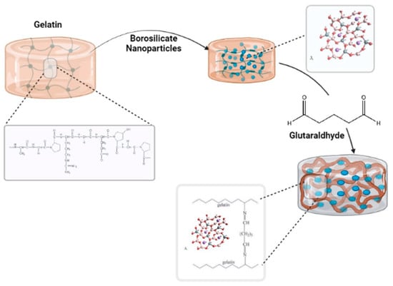 Schematic study of the cross-linking mechanism of gelatin/borosilicate/glutaraldehyde nanocomposite hydrogels.