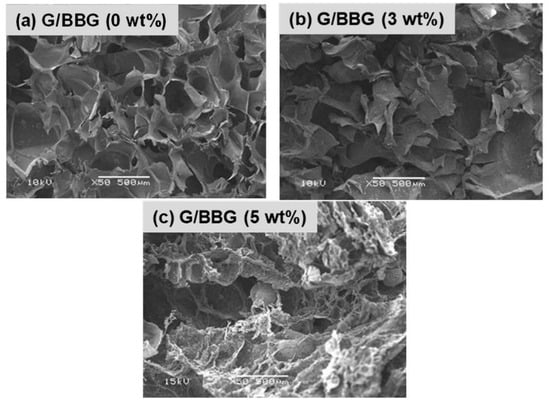 The SEM micrographs of the control gelatin hydrogel and the G/BBG nanocomposite hydrogels with different BBG contents (3 and 5 wt.%) are shown in Figure 5. All samples revealed macroporous interconnected structures. However, as the BBG content was increased, the G/BBG nanocomposites exhibited rough and porous network structures with particles scattered in the pore walls, which increased in number and occupied a larger region [19]. The hydrogel with BBG nanoparticles may have better mechanical properties than pure gelatin hydrogel, implying a better microenvironment for cell attachment and development [19].