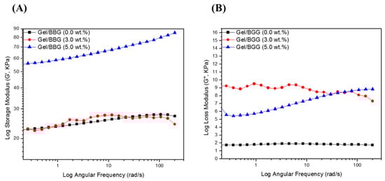Log scale of (A) Storage modulus (Gʹ) and (B) loss modulus (Gʺ) of the B/BBG nanocomposite hydrogels as a function of the angular.