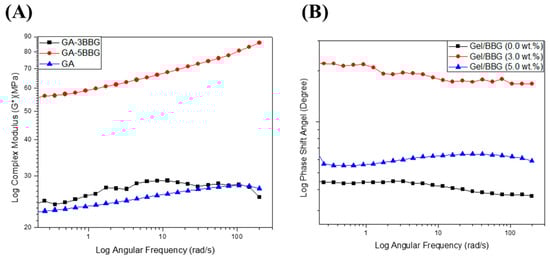 Log scale of (A) complex shear modulus (G*) and (B) phase shift angle of the B/BBG nanocomposite hydrogels as a function of the angular frequency.