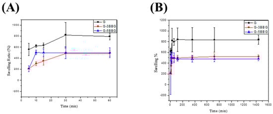 During in vitro cell culture studies, the swelling behavior of the hydrogel scaffolds is significant. The swelling of the hydrogel scaffolds allows for body fluid to be absorbed and for cell nutrients and metabolites to be transferred within the scaffolds. Furthermore, swelling expands the pore size of the scaffolds, increasing the internal surface area available for cell infusion and attachment. Swelling under physiological conditions should be controlled, otherwise the bone scaffolds can weaken and degrade quickly. Figure 8 depicts the swelling of the control and the nanocomposite scaffolds as a result of water absorption in DI at room temperature. Due to their highly interconnected and porous nature, all three classes of scaffolds were able to swell by absorbing water and showed relatively high water absorption [22]. The swelling ratio of a scaffold containing 0 wt.% BBG, alternatively, was substantially higher than that of the scaffolds containing different quantities of BBG. After 1 h, the swelling caused a mass increase of 130 ± 3.41% in the control scaffold, while the swelling of the scaffold containing 5 wt.% BBG was limited to 80 ± 2.71%, that is a 62.5% reduction in the swelling ratio. The swelling behavior of the hydrogels is affected by the hydrophilic group present in the polymer chains [6]. The swelling ratios were equilibrated after 30 min as shown in the following Figure 8A. This phenomenon may be explained by the physical trapping of the BBG-NPs within the hydrogel, which is caused by hydrogen bonds forming between the BBG surfaces and the polymer matrix. The G/BBG scaffolds were supposed to become stronger as the water absorption was reduced. Furthermore, since the nanocomposite scaffolds are hydrophilic, they can be used for bone regeneration. The hydrophilicity of the scaffolds allows for the absorption of body fluid, which primarily consists of water, and is critical for nutrient and metabolite diffusion.