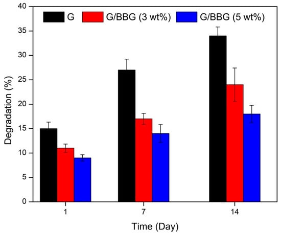 The physiological stability of composite hydrogels is crucial during bone regeneration; the degradation rate should correspond to bone ingrowth and increase functional recovery [19]. The degradation of the control and nanocomposite scaffolds was studied in PBS solution for 14 days. As shown in Figure 9, the incorporation of BBG in the scaffolds revealed a significant decrease in the degradation rate. It can be observed that the degradation rates of the scaffolds were dependent on the BBG contents. For example, the control scaffold showed a degradation rate of 14.5%, 27.8%, and 34.2% on the first, seventh, and fourteenth days, respectively. On the first, seventh, and fourteenth days, the 5 wt.% BBG nanocomposite scaffold showed a lagging degradation rate of 8.3 percent, 14.7 percent, and 17.3 percent, respectively.