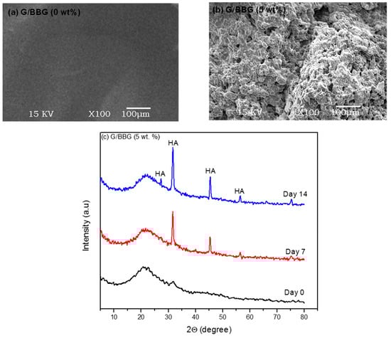 The effect of BBG on the apatite-forming ability of G/BBG nanocomposite hydrogels: (a) and (b) SEM images showed the better apatite-forming ability after 14 days with the addition of 5 wt.% BBG and (c) XRD patterns indicated the HA formation.