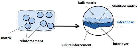 The nature of the interface between the matrix and filler is an essential factor influencing the nanocomposite properties. According to Sharpe [33], the interface is defined as an intermediate region of two phases in contact, whose composition, structure, and properties vary throughout the area and are generally different from the two phases. Such phases are rarely devoid of chemical interaction. The volume of material affected by the interface interaction forms a a three-dimensional zone, called the interphase. The term interphase is widely used in the adhesion community to indicate the presence of a chemically or mechanically altered zone between adjacent phases [34,35]. The interphase concept, according to Drzal [36], is schematically represented in Figure 1.