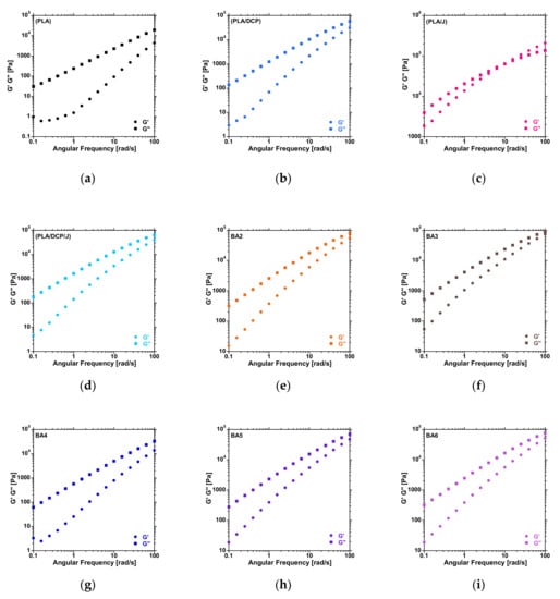 Moreover, a dramatic decrease in Gω was noticed in the PLA/J system (Figure 2c), indicating an increase in the MW of PLA. A horizontal shift to higher values could be noticed in the PLA/DCP/J system (Figure 2d); this suggests that there was a reduction in the MW of PLA, which could be attributed to chain scission when both DCP and Joncryl were added. The incorporation of BA did not significantly change the MW of the PLA/DCP/J system (Figure 2e–i), as can be seen from the distance between G′ and G″ at 100 rad/s.