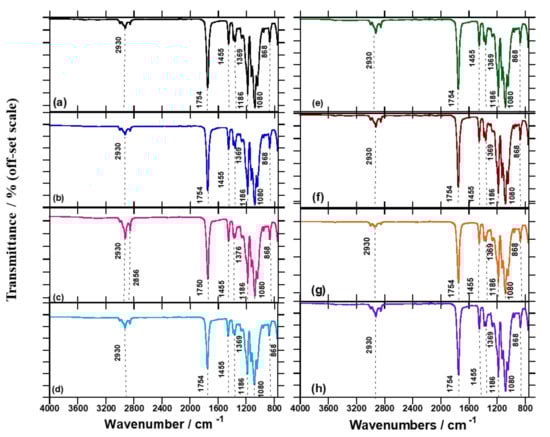FTIR spectra for (a) neat PLA, (b) PLA/DCP, (c) PLA/J, (d) PLA/DCP/J, (e) PLA/BA, (f) PLA/BA/DCP, (g) PLA/BA, and (h) PLA/BA/DCP/J samples.