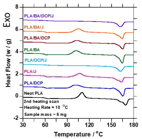 DSC traces of the second heating curve of neat PLA and samples containing DCP/Joncryl and BA.