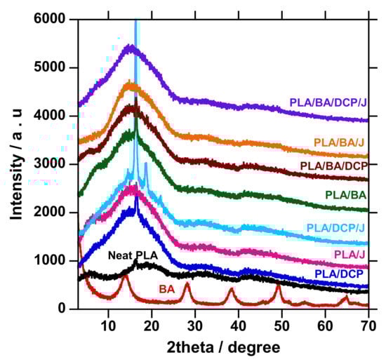The XRD patterns of neat PLA, BA powder, and composites are shown in Figure 7. The diffraction patterns on the as-received BA powder were observed at 2θ = 13.98°, 28.12°, 38.36°, 49.46°, 55.11°, and 64.60°, attributed to the (20, 120, 031, 200, 002, and 151 crystallographic planes, respectively. In the case of neat PLA, the broad amorphous peak at 16.50° was observed and ascribed to the 200/100 crystallographic plane of PLA crystal, consistent with the features of PLA [,,,]. Upon the addition of various BA concentrations to PLA, the features of BA at the peak of interest (2¦È = 13.98°) were also recognized, signifying the presence of the filler in the composites. On the other hand, the XRD patterns of all of the composites show an intensive peak around 16.21°, and have slightly moved to a higher angle, suggesting that the crystal size of the composites has decreased due to the interaction and distribution of BA in the PLA matrix []. Chain branching contributes to the higher crystallinity of PLA.