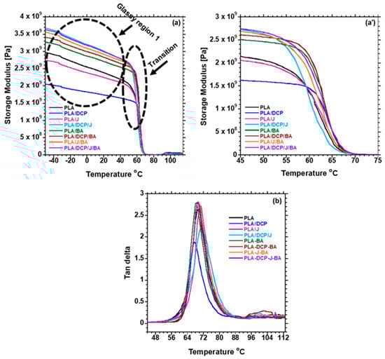 Furthermore, the concurrent addition of DCP and Joncryl to PLA/BA further increased the E′. The presence of both DCP and Joncryl induces chemical bonding between PLA and BA, as shown in Figure 4; hence, better distribution of BA, as shown in Figure 5. This results in strong interfacial bonding between PLA and BA; hence, the E′ increases when both DCP and Joncryl are added. The increase in E′ can also be attributed to the increase in crystallinity, as shown in Figure 3. With an increase in temperature, the E′ decreased, as expected. Region 2 illustrates the Tg of all of the samples, as listed in Table 6 and shown in Figure 7; the Tg of all of the samples remained almost the same, indicating no effect of BA distribution on the Tg. The Tg of all of the samples examined from the tan delta curve (Figure 7) clearly shows no effect on the Tg, although it was expected that the Tg would move to higher temperatures due to the chain restriction in the presence of BA particles. Overall, it is evident that the storage modulus was dependent on the distribution of BA.