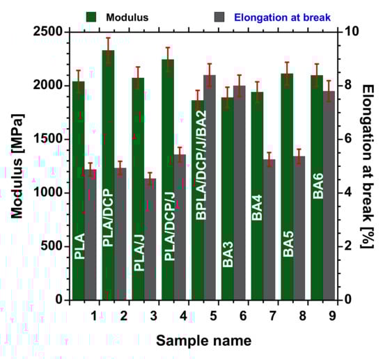 Figure 9 displays the tensile modulus (E′) and elongation at break (εba) of the neat PLA, PLA/DCP, PLA/J, PLA/DCP/J/, and PLA/DCP/J/BA composites at various concentrations of BA. The neat rigid PLA shows a high E′ of 2040 MPa. Expectedly, PLA exhibits a low εba of 4.8%. Upon the structural modification of PLA using DCP and Joncryl individually, the εba did not change significantly. However, the E′ of PLA/DCP was higher than that of PLA and PLA/J. The entanglement of crosslinked structures could have caused this increase.
