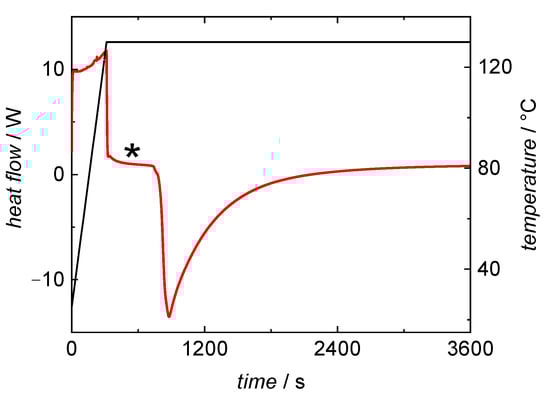 DSC curve from a BA polymerization at 130 °C under isothermal conditions. The heat flow curve (red) and temperature profile (black) were recorded while heating to the desired temperature and during the bulk polymerization. * marks the baseline used for data evaluation.