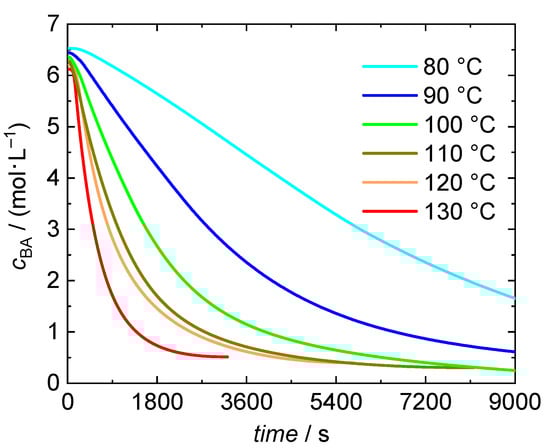 The BA concentration as a function of time is calculated according to Equation (8), with the initial BA concentration, cBA,0.