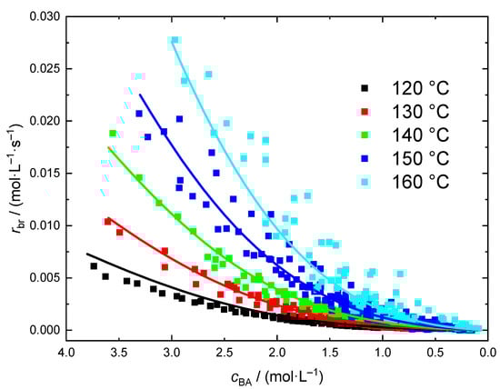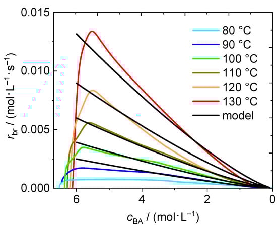 Rate of polymerization as a function of the actual BA concentration in the reaction mixture for the temperatures between 80 °C and 130 °C. Data resulting from the model calculation with Equation (4) is shown in black.