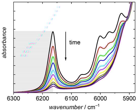 To estimate monomer conversion the absorption band at 6166 cm−1 [], which is assigned to the first overtone of the olefinic C-H stretching vibration, was employed. The half peak is integrated from the peak maximum at 6166 cm−1 to 6300 cm−1 using a horizontal baseline at the latter wavenumber as illustrated by the grey area in Figure 4. To minimize contributions from absorptions assigned to the saturated C-H stretching vibrations below 6166 cm−1 the half peak rather than the full peak is integrated. During polymerization the fraction of monomer is lowered and consequently, the peak intensity decreases.