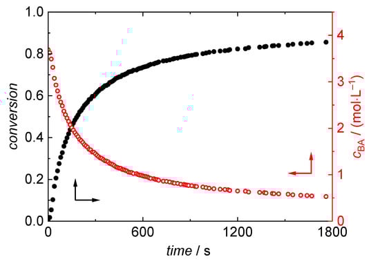 The overall reaction rate, rbr, is calculated according to Equation (2) with the exothermal heat-flow, d(∆H)/dt, resulting from the polymerization reaction, cBA,0, and the standard reaction enthalpy ∆HBA0 = −79.84 kJ·mol−1 taken from [].