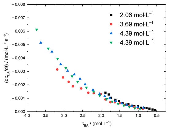 dcBA/dt as a function of the current monomer concentration derived from NIR spectra recording during polymerizations at 120 °C. The legend gives the initial BA concentrations, cBA,0.