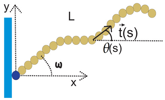 We consider a semiflexible filament, modelled as a wormlike chain (WLC), in the geometry shown in Figure 1. The total contour length of the chain is L, its persistence length is , one of its ends is grafted (i.e., both its position and its orientation are fixed at that point), and it is confined to fluctuate in two dimensions. We point out that the grafting substrate shown in the figure is introduced solely for the purpose of specifying the geometry, and it does not imply any steric interaction with the chain (it can be viewed as a phantom substrate). The effective free energy functional of the WLC is