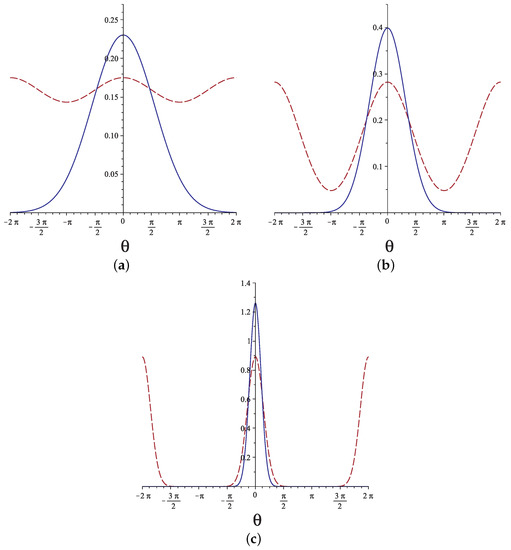 where is the initial orientation (in the polymer case, the orientation of the grafted end) and is the Jacobi theta function of third order. It is clear that the solution to given in Equation (5) as a function of has a periodicity of . Quite often, this result is directly transferred from the quantum rotator to the WLC [18,19,20,21,22]. However, this mathematical analogy should not be carried too far. The two-point orientational probability distribution of the WLC, unlike the quantum rotator density operator or propagator, is not invariant under full rotations of the tangent vector at a point along the chain contour. Such a rotation corresponds to a different conformation of the polymer. Indeed, this point becomes clear in the analysis of loops in Euler elastica [23,24]. In our case, the solution to Equation (3) belongs to a different functional space from that of the quantum rotator states and should be expressed in terms of “plane waves”,