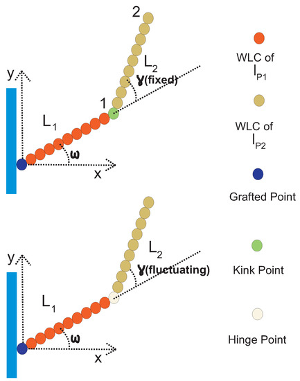 We consider two WLCs, both in the stiff limit, which can have different persistence lengths. They are jointed at a kink, and the kink angle, , is fixed (it does not fluctuate). In Figure 3, we show the configuration of such a grafted kinked pair of arms. The first arm is grafted on the substrate with orientation and it has persistence length and contour length . The second arm is attached to the endpoint of the first arm at the kink point, and it has persistence length and contour length, . We label the endpoint of the first arm by the number 1, which is also the kink point. We also label the endpoint of the second arm of the structure by the number 2. The endpoint of the structure is the same as the endpoint of the second arm.