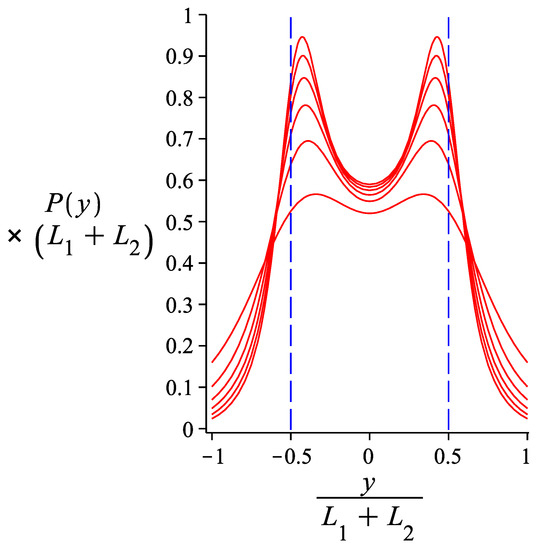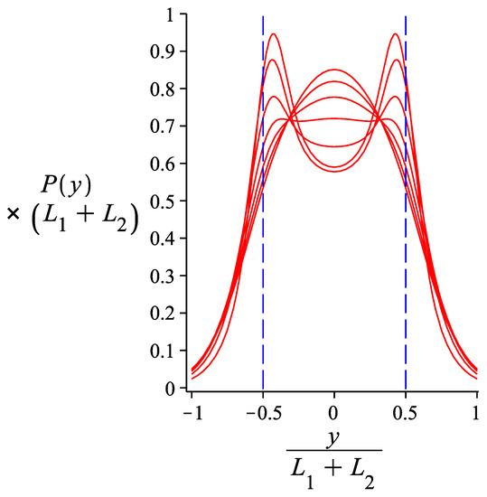 The probability density of the transverse component of the free end of a grafted system of two hinged WLCs. The curve is obtained from Equation (27). The varying parameter is ; m where . The lower the value of , the smoother the bimodality of the curves. The fixed parameters are: m, and .