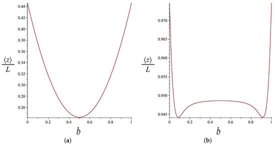 We can easily see that for , we recover the extension of the intact WLC (without a hinge) with contour length L. The interesting feature of the extension as a function of the hinge position according to Equation (43) is that it has a minimum below the plateau of Equation (38) and that the minimum occurs at a value of b for which Equation (43) holds. Because the two ends are symmetric, we obtain bimodality in the response of a nunchuck to stretching as a function of the hinge position. Equation (43) holds for , whereas Equation (38) holds for . Even though we do not have an exact result for the entire range of b, the bimodality is a robust feature. These features are shown in Figure 8. The tension and the bending stiffness of the arms correspond to .