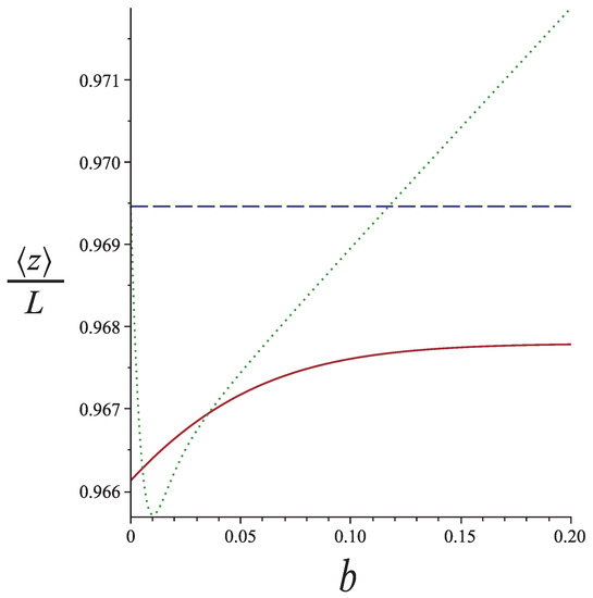 The mean extension of a semiflexible nunchuck in as a function of the hinge position b for and . The solid line corresponds to the weakly bending approximation of the hinged WLC (Equation (38)). The dotted line corresponds to a nunchuck whose small arm is a rigid rod and the long arm a weakly bending WLC (Equation (43)). The dashed line gives the extension of the corresponding intact WLC (without any hinge).